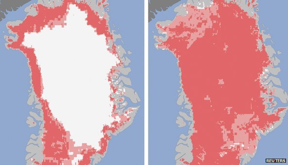 “Melting even occurred at Greenland’s coldest and highest place, Summit station.The thawed ice area jumped from 40% of the ice sheet to 97% in just four days from 8 July.” BBC reported.