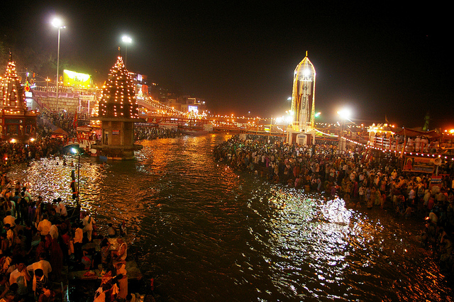 However, when finally the Kumbha(pot) containing the Amrit(nectar) appeared, gods did not want demons to drink the nectar as that would make them immortal. A fierce battle broke out between the gods and demons in the skies. During the battle, the celestial bird, Garuda, the vehicle of Vishnu flew away with the Kumbh that held the nectar. Drops of holy nectar fell at four places on Earth – Prayag(now known as Allahabad), Haridwar, Ujjain and Nashik. To remember this divine event Maha Kumbh Mela is celebrated in every twelve years at the four sacred places where the drops from Kumbh were fallen.