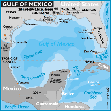 The Gulf of Mexico is the largest gulf in the world. It was formed approximately 300 million years ago as a result of the sinking of a seafloor. It is located on the coast of Mexico and The United States of America. It is an extension of Atlantic ocean. It is an extremely valuable source of seafood for The United States.
