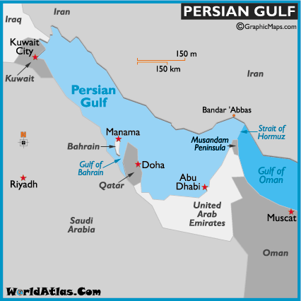 Persian gulf is another crucial gulf surrounded by the Arab states of — Iran, Iraq, Bahrain, Kuwait, Qatar, Saudi Arabia and the United Arab Emirates. It is an extension of Arabian sea. Most of the world’s oil is shipped through the Persian Gulf to all the other parts of the world.